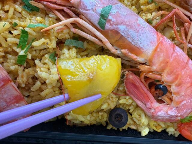 コストコの惣菜コーナーでもひときわ目を引く「パエリア」。開けた瞬間、色鮮やかなパプリカとオリーブ、そして堂々と並ぶ4尾の大きなエビ。魚介の香りとスパイスの香ばしさが漂い、まるでスペインのレストランに来たかのような気分になります。