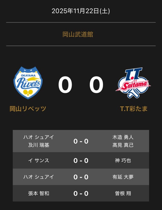 ノジマTリーグ 2025-2026シーズン 公式戦 11月22日開催 岡山リベッツ vs T.T彩たまの対戦オーダーを発表いたします。