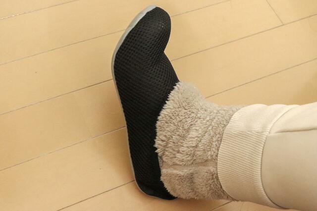 履き口にフィット感のある「おうちスリッポン」なら、ルームソックスを履いていても脱げにくいのではと考えたんです。