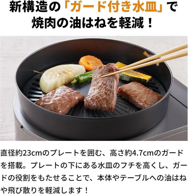 直径約23cmの焼き面プレートを囲む、高さ約4.7cmの油はねガードを搭載し、プレートの下にある水皿のフチを高くしてガードの役割をもたせることで、本体やテーブルへの油はねや飛び散りを軽減します。