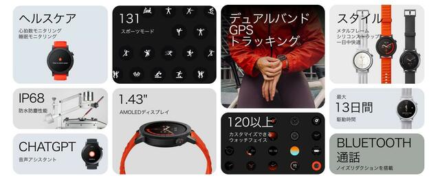 ①ディスプレイの拡大・高輝度化:1.43インチのAMOLEDディスプレイ(前モデルは 1.32インチ AMOLED )/60fpsのリフレッシュレートで鮮明かつスムーズな反応