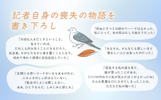 本書は、朝日新聞で2020年~2025年に取材・掲載された人気連載「喪の旅」の、待望の書籍化となります。掲載された30人それぞれの喪失の物語を収録。加えて、取材した記者自身の夫を亡くした経験をあらたに書き下ろしてまとめた一冊です。