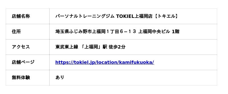 「運動習慣をつけ、美しく健康な身体に導く」がコンセプトのパーソナルトレーニングジム『TOKIEL 【トキエル】』を展開する株式会社TIU(本社:東京都台東区、代表取締役 篠田拓也)は、2025年12月6日に東武東上線 「上福岡」駅 徒歩2分(住所:〒356-0004 埼玉県ふじみ野市上福岡1丁目6−13 上福岡中央ビル 1階)に『パーソナルトレーニングジム TOKIEL上福岡店【トキエル】』がオープン。