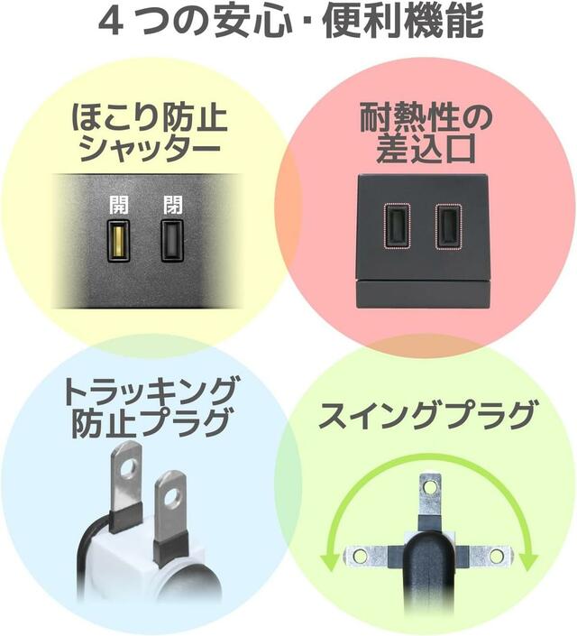 プラグ自体もトラッキング防止のものになっていたりと、もしもの場合に起こりえる「電気火災」を予防してくれる機能もしっかり備わっています。