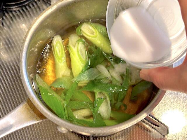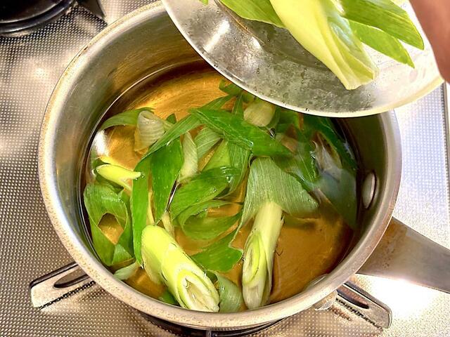 3. 沸騰したらねぎを加えてひと煮立ちさせる。