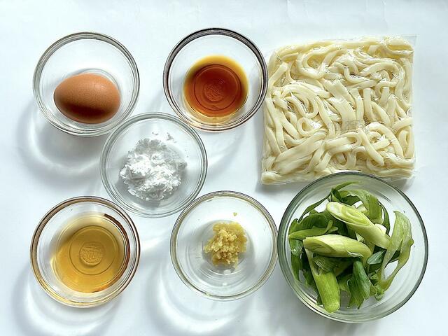 1. 片栗粉は同量の水で溶いてよく混ぜておく。ねぎは食べやすい大きさにカットし、しょうがはすりおろしておく。