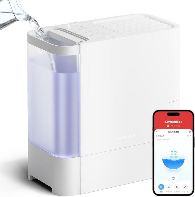 さらに、別売りの「SwitchBot温湿度計」と連携することで、加湿したい場所の温湿度をリアルタイムで取得して、適した加湿量に自動調整が可能。