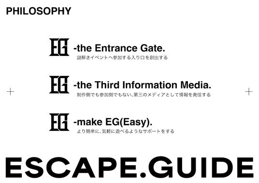 ESCAPE.GUIDEの頭文字でもあるロゴの「EG」の文字には、"入り口"を表す"Entrance Gate"の意味とともに、「気軽に謎解きに参加できるように」という想いを込めた"EG(イージー)"の精神を表しています。