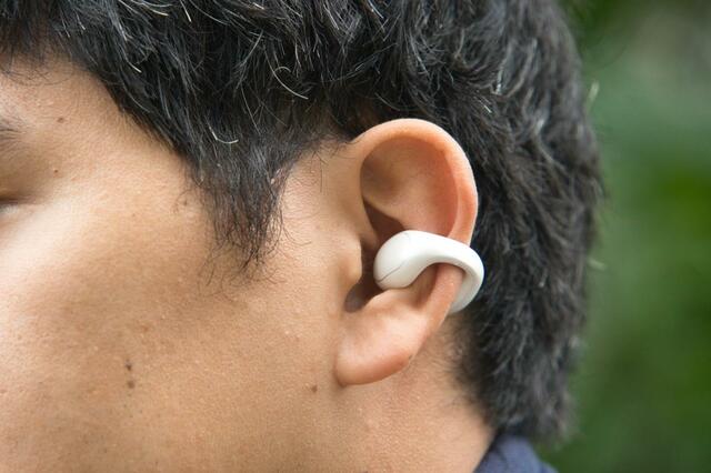 カナル型のように耳をふさぐタイプではなく、耳に軽くひっかけるオープンイヤー方式です。