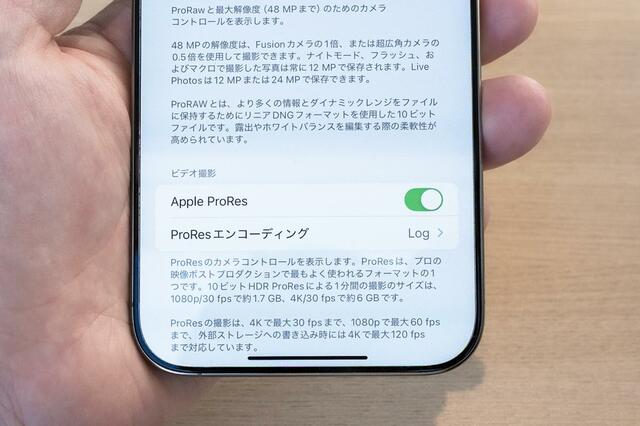iPhone 15 Proと16 Proシリーズでは、Apple ProRes形式で撮影中の動画を直接SDカードへ保存することも可能。