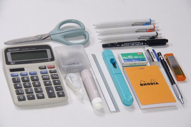 電卓にシャーペンやボールペン、ケース入りのクリップにハサミなど、なかなかの量がありますが……。