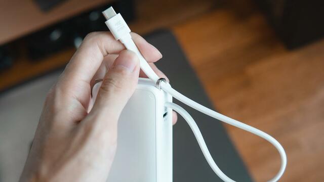 手のひらにすっぽりおさまるサイズ感で、重さは約200g。このコンパクトボディにUSB-Cケーブルが内蔵されています。