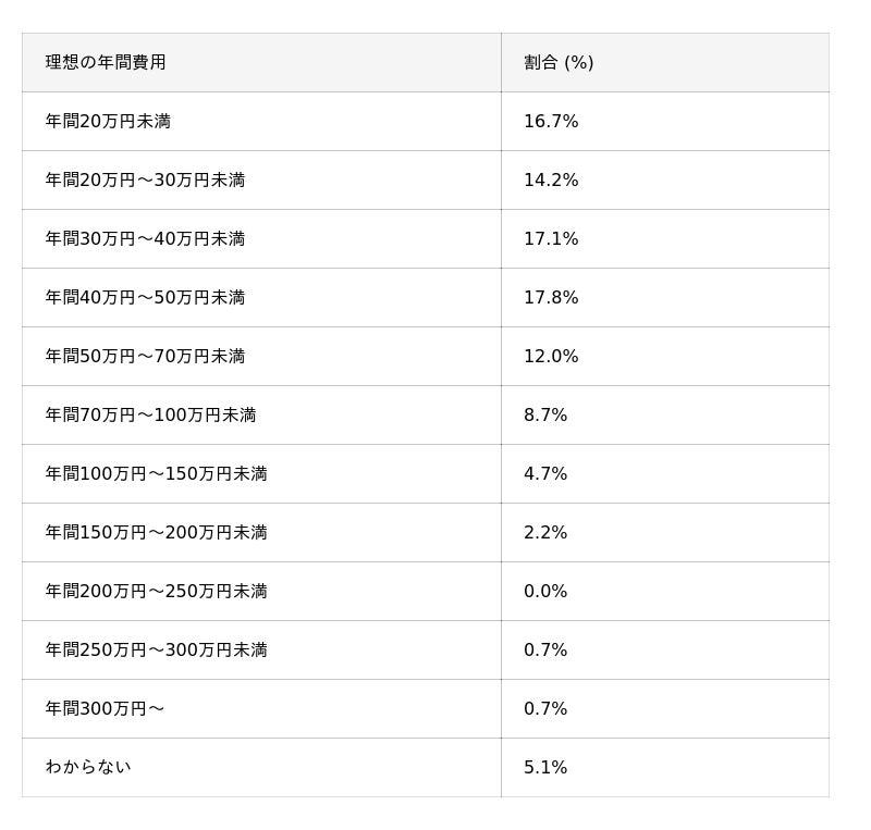 次に、より低い価格帯に着目すると、「年間40万円未満」(「20万円未満」・「20~30万円未満」・「30~40万円未満」の合計)を理想とする回答が合計で48.0%(約5割)に達しました。保護者の半数近くが、この範囲を妥当なラインと考えていることがわかります。