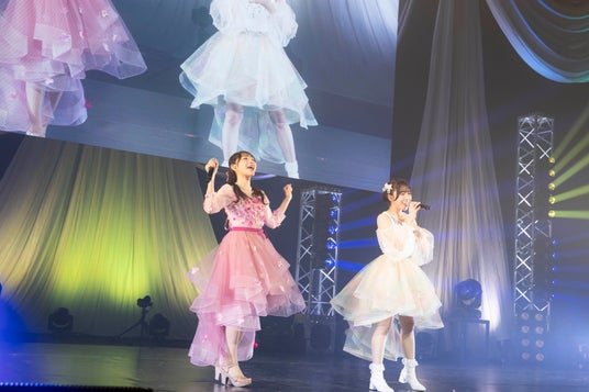 白をベースに、ブルーとピンクを差し色にした可愛い衣装で「桃色片想い」と「かわいいだけじゃだめですか?」の2曲を披露!