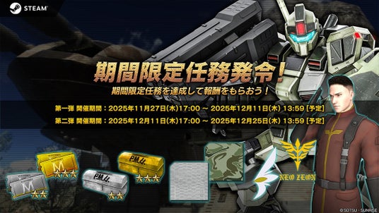 また、開発ビデオレター公開を記念して、PlayStation(R)版とSteam(R)版共に、「RX-93ff νガンダム LV1」や「MSN-04FF サザビー LV1」、「ゼク・ツヴァイ LV2」などの★4機体からランダムで1機が確定入手できる、1日1回無料の「開発ビデオレター公開記念 MS確定無料抽選配給」を11月27日(木)まで実施しております。