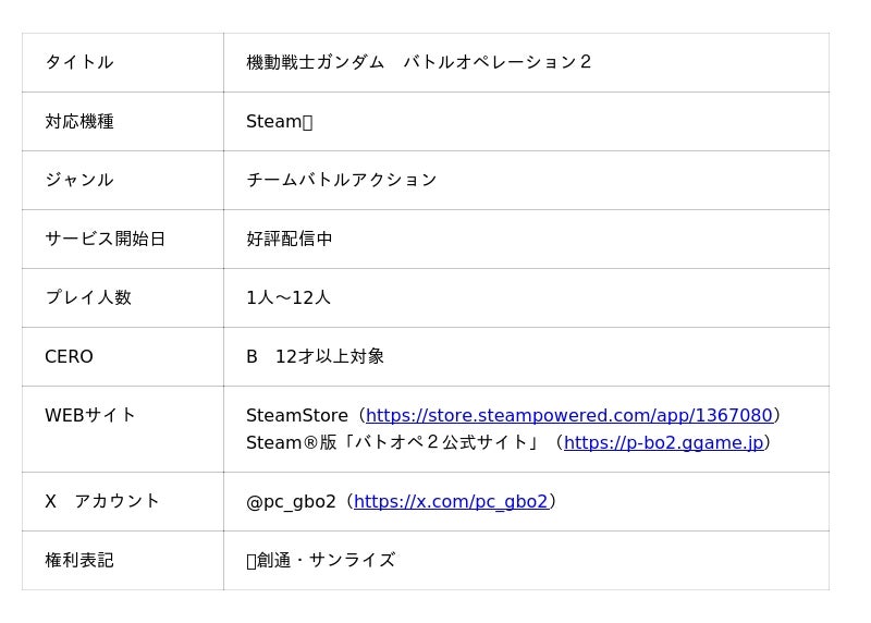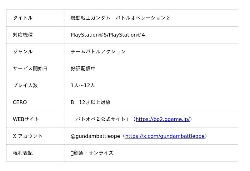 オンライン専用ゲーム『機動戦士ガンダム バトルオペレーション2』 (以下、『バトオペ2』)にて、