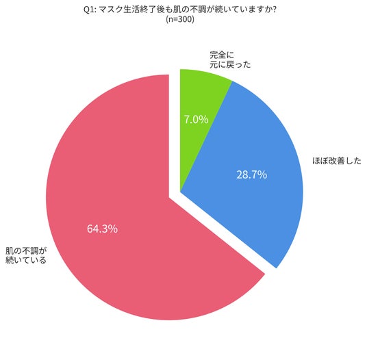 その結果、64.3%の方が「マスクをやめた後も肌の不調が続いている」と回答し、マスク時代に受けた皮膚ダメージが長期化している実態が明らかになりました。