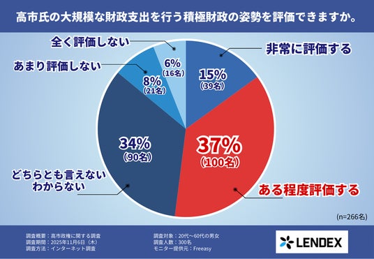 大規模な財政出動を伴う積極財政の姿勢について、「非常に評価する」(15%)、「ある程度評価する」(37%)を合わせると、52%が肯定的と回答しました。