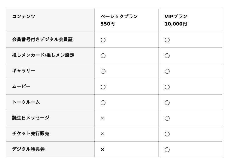 イベントチケットの先行販売をはじめ、会員限定のギャラリーや、ムービー、メンバーとみんなのトークルームなど、さまざまなコンテンツを展開。さらに、現地イベントで使えるチェキ引換券や音声付き写メ引換券といった特典も用意しています。