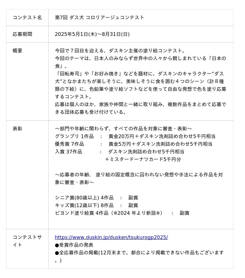 株式会社ダスキン(本社:大阪府吹田市、社長:大久保 裕行)は、2025年5月1日(木)から8月31日(日)まで開催された塗り絵コンテスト、「第7回 ダス犬 コロリアージュコンテスト」の受賞者を決定いたしました。選出された、グランプリ1作品、優秀賞7作品、入賞37作品、増田セバスチャン特別賞2作品、シニア賞4作品、キッズ賞8作品、ビヨンド塗り絵賞4作品の合計63作品を、本日11月25日(火)よりコンテストサイトにて発表します。