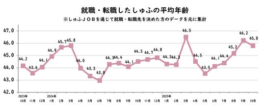 転職しゅふの平均年齢は、前月比-0.4歳、前年同月比+1.3歳の45.8歳となりました。
