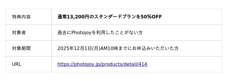 累計撮影数40,000人突破を記念しまして、Photojoyで最も人気のあるスタンダードプランを50%OFFでご利用いただけるキャンペーンを実施いたします。