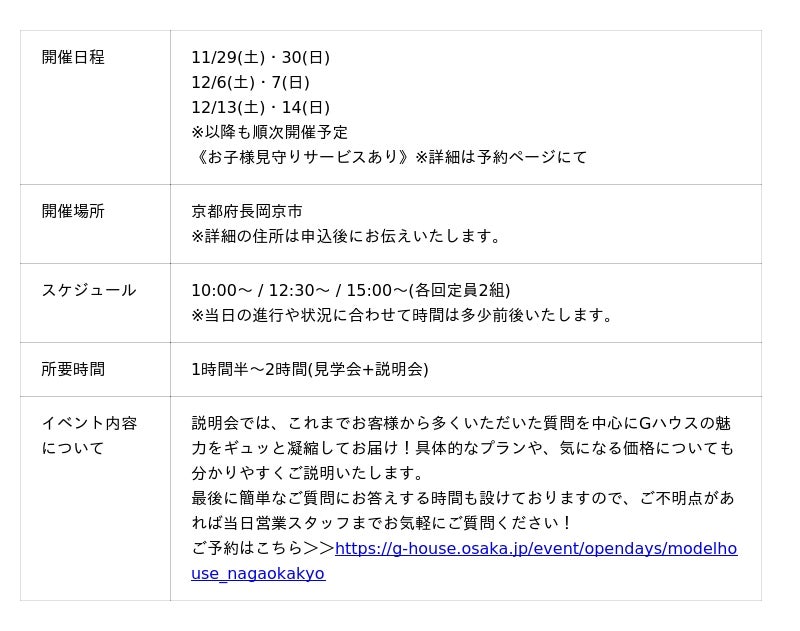 ご予約はこちら>>https://g-house.osaka.jp/event/opendays/modelhouse_nagaokakyo