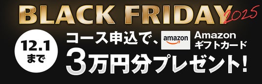 10月31日までにコースをお申込みいただき、かつ当社が定める期限までに決済が完了した場合、Amazonギフトカードを3万円分プレゼントいたします。詳しくはこちらをご確認ください。