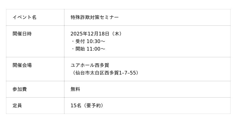 本セミナーでは、仙台南警察署より担当官をお招きし、実際に増加している「特殊詐欺」の最新手口や、その対策方法についてわかりやすく解説します。近年、電話やメールを用いた巧妙な詐欺が続いており、高齢者だけでなく幅広い年代の方にとって重要な情報が詰まった内容となっております。