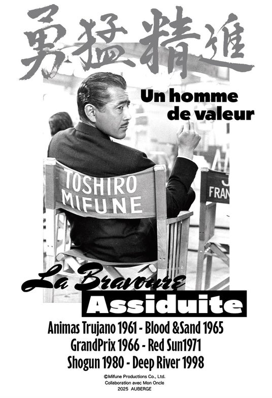 そしてフレンチヴィンテージを得意とする〈AUBERGE(オーベルジュ)〉らしく、“もしパリのチャイナタウンにあるミニシアターが三船映画のポスターをつくったら?”という架空のストーリーに基づいた、粋なデザインのTシャツも制作しました。