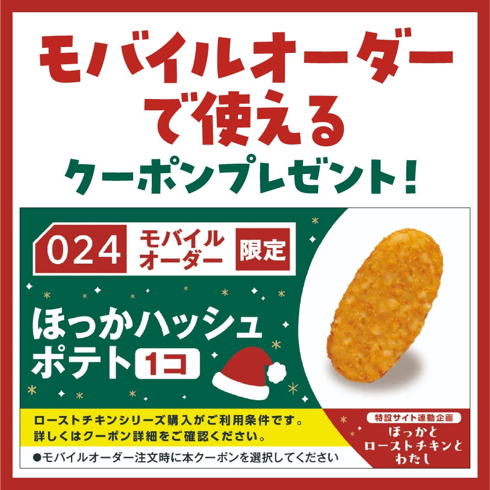 ほっかアプリ内にて、期間中にローストチキンシリーズを1品ご購入で使える「ほっかハッシュポテト(1個)」のクーポンが期間限定で登場します。