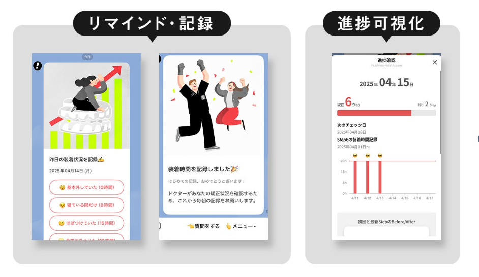 Oh my teethは次の2つの機能によってユーザーのモチベーションを維持し、矯正完走までサポートします。