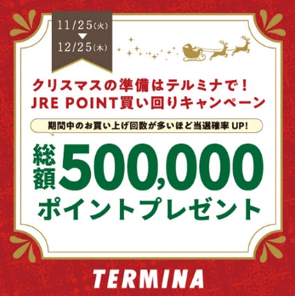 内容:期間中、JRE POINT会員が「錦糸町テルミナ」全店で2回以上お買い物、かつ合計5,000円以上(税込)お買い上げいただくと、抽選で最大10,000ポイントが当たります。お買い物回数に応じて当選確率がアップするので、クリスマス準備のアイテムは