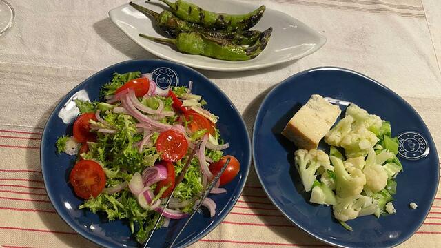 サラダはフリゼレタス、アーリーレッド、トマト。カリフラワーとゴルゴンゾーラ、焼き万願寺。