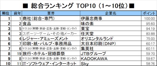 前回5位だった東宝が3位にランクアップ。女性ランキングでは1位(前回4位)に入りました。今年の興行収入ランキングでトップを走る「劇場版「鬼滅の刃」無限城編 第一章 猗窩座再来」、「国宝」など多数の人気作品で、2025年度は最高益を見込み、人気につながっています。