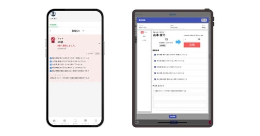 種目別進級の画面イメージ(左:保護者・生徒専用アプリ「れんらくアプリ」 右:コーチ管理用画面)
