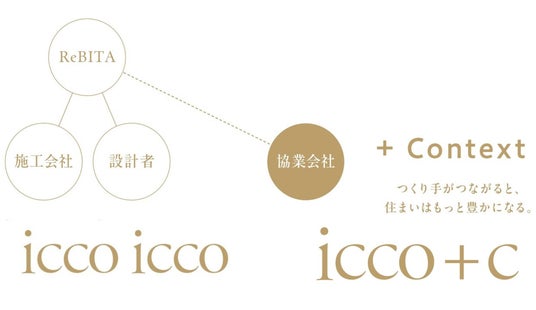 「icco+c」は、ものづくりをはじめとする様々な分野の専門家を外部パートナーとして迎え、住まいの領域を超えた知見や技術をプラスすることで、リノベーションの可能性を追求する協業型プロジェクトです。従来の「icco icco」のリノベーションは、リビタ、設計者、施工会社の3社で企画を進めますが、新たに外部パートナーが加わる「icco+c」では、より多角的な視点から新しい暮らしのかたちをご提案いたします。多彩なつくり手が垣根を越えて手を取り合うことで、一戸ごとの住まいに深い個性と新たな可能性を共創し、一歩先の暮らしのあり方を追求します。