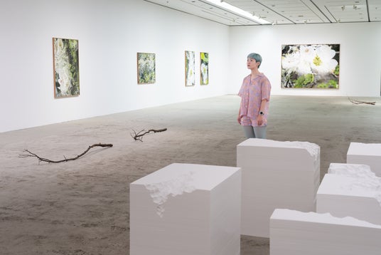 「Nerhol 種蒔きと烏 Misreading Righteousness」展を取材中の暮田真名さん 撮影:筒口直弘(新潮社)