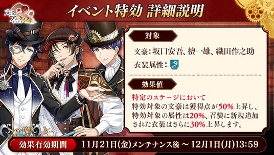 さらに、イベントと同時に開催される限定召装『広津柳浪ヲ救出セヨ 後編』にて新規追加された「坂口安吾」「織田作之助」「檀一雄」の〈クロックパンク衣装〉を編成すると、得点の獲得率がそれぞれ30%上昇します。