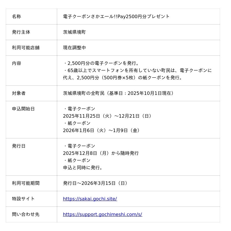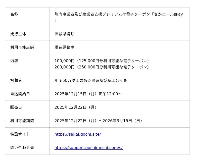 Gigi株式会社(代表取締役:今井了介、所在地:東京都港区)は、茨城県境町(町長:橋本正裕)と連携し、物価高騰対策として境町の全町民に向けて、第6弾「電子クーポンさかエール!!Pay2500円分プレゼント」を2025年12月8日(月)より順次発行、並びに「町内事業者及び農業者支援プレミアム付電子クーポン「さかエール!!︎Pay」」の申し込みを2025年12月15日(月)正午12時00分より開始します。