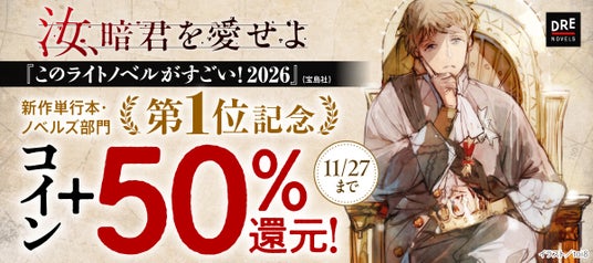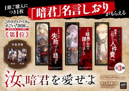 株式会社ドリコム(本社:東京都品川区、代表取締役社長:内藤裕紀)は、DREノベルスより好評発売中の『汝、暗君を愛せよ』が「このライトノベルがすごい!2026」(宝島社)にて、【新作単行本・ノベルズ部門】の第1位を獲得したことをお知らせいたします。ドリコムが出版事業へ参入してから3年目での部門1位受賞となり、極めて短期間での快挙達成となりました。