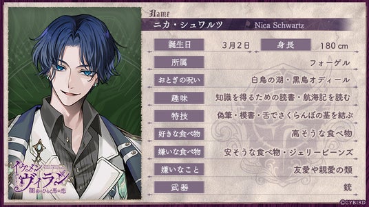 株式会社サイバード(本社:東京都品川区、代表取締役社長 兼 CEO 長嶋 貴之、以下、「サイバード」)が手掛ける、全世界でのシリーズ累計会員数4,500万人を誇る女性向け恋愛ゲーム「イケメンシリーズ」の人気作『イケメンヴィラン 闇夜にひらく悪の恋』(以下、『イケメンヴィラン』)は、「ニカ・シュワルツ(CV:柿原 徹也)」(以下、「ニカ・シュワルツ」)の本編ストーリーを、2025年11月24日(月)より配信開始しました。