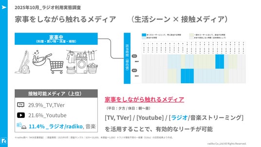 その一方で、ディスプレイを注視できない時間や、あえて画面から離れたい瞬間に、「ラジオ」という選択肢を取るユーザーも増えています。テレビや動画、SNSが主に「画面の前」での接点を担う一方で、ラジオやradikoは“移動”や“ながら”といった生活動線の中で、ブランドとの新しい接点を生み出しています。