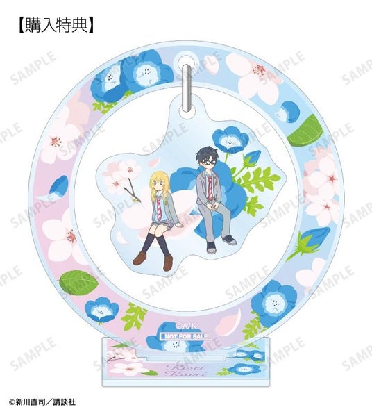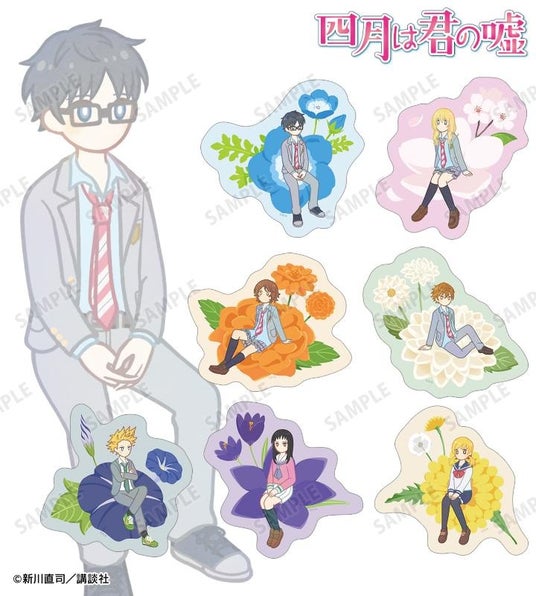 有馬公生、宮園かをり、澤部椿、渡亮太、相座武士、井川絵見、相座凪のイラストをボタニカルデザインに落とし込んで繊細なタッチで新たに描き起こし、ゆらゆら動くアクリルスタンドに仕上げました。