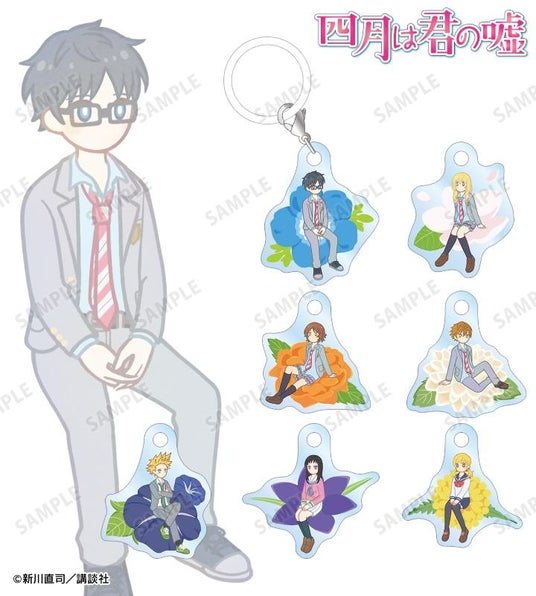 有馬公生、宮園かをり、澤部椿、渡亮太、相座武士、井川絵見、相座凪のイラストをボタニカルデザインに落とし込んで繊細なタッチで新たに描き起こし、ダイカットのアクリルチャームに仕上げました。