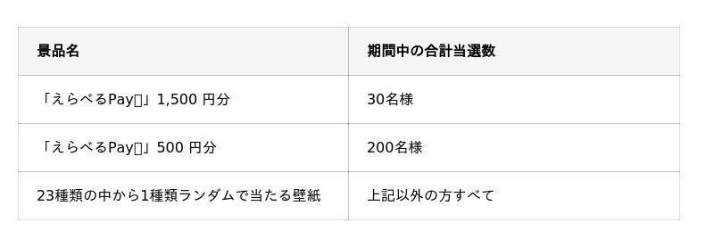 キャンペーン期間は7日間、応募チャンスは1日1回。景品として、「えらべるPay(R)」1,500円分を合計30名様、500円分を合計200名様(計230名様)、その他の方に壁紙をランダムでプレゼントします。壁紙は23周年にちなんで、23種類をご用意いたしました。どの絵柄が当たるか、お楽しみに!