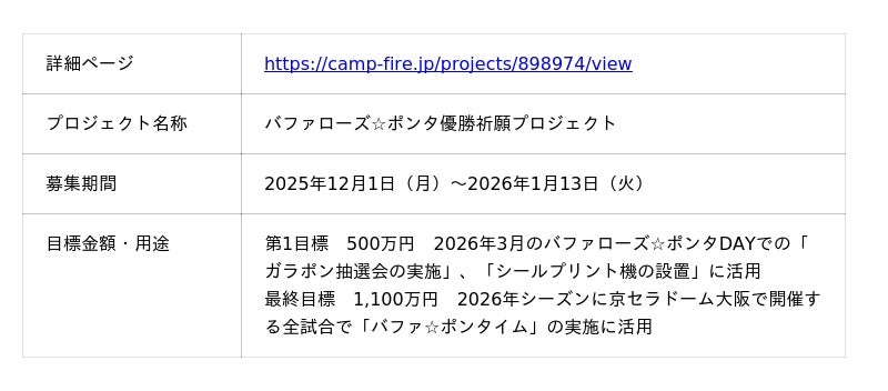 クラウドファンディングの目標金額は2段階で、第1目標は500万円、最終目標は1,100万円となります。第1目標までの支援金は、2026年3月のバファローズ☆ポンタDAYでのバファローズ☆ポンタグッズがもらえる「ガラポン抽選会」の実施と、バファローズ☆ポンタ10周年記念デザインのフレームで撮影できる「シールプリント機」の設置に活用させていただきます。最終目標の支援金は、2026年シーズンに京セラドームで開催される全試合で「バファ☆ポンタイム」を復活させる目的で活用させていただきます。バファ☆ポンタイムは、イニング間にバファローズ☆ポンタグッズを掲げて、オリックス・バファローズを応援する企画です。返礼品は、バファローズ☆ポンタグッズを本プロジェクト限定デザインの缶に詰め込んだオリジナルセットや金色のバファローズ☆ポンタぬいぐるみなどをご用意しています。