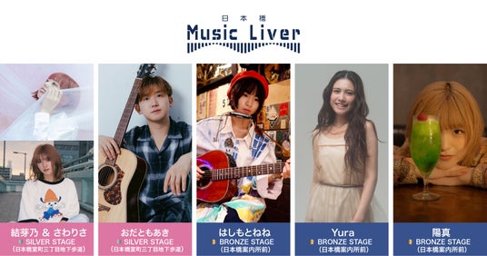 SILVER STAGE(日本橋室町三丁目地下歩道)には、おっとりとした雰囲気ながら、ステージ上ではハツラツとしたキャラとキラキラボイスで聴く人を魅了する結芽乃と、大阪府出身シンガーソングライターのさわりさ、ノスタルジックな歌声と楽曲で幅広い世代に支持を受けるおだともあきが登場。