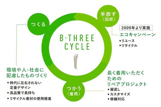 「アパレル否定型アパレル」として、流行に左右されないものづくりを掲げるビースリーは、よいものを長く着用していただくために、“売って終わり”ではなく、お客様とともに循環型ファッションを推進いたします。