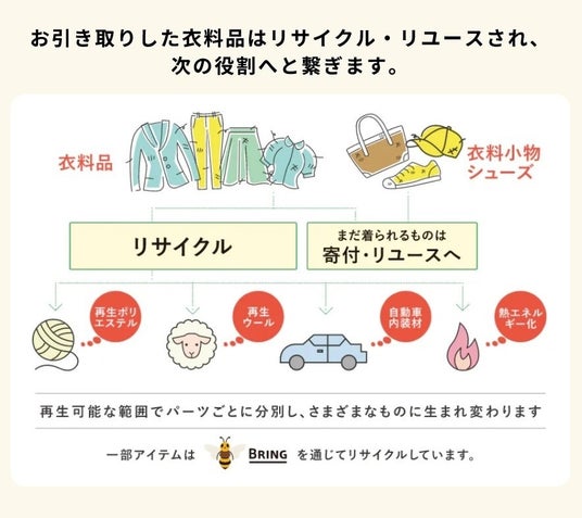 まだ着用できる衣類は寄付や再利用へ、再利用できない衣類は繊維リサイクルを通じて、自動車内装材や再生ポリエステルなどの資源に生まれ変わります。